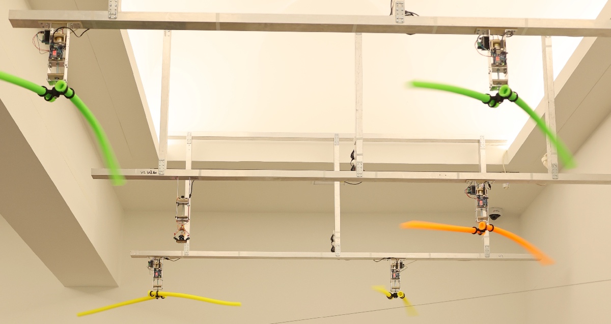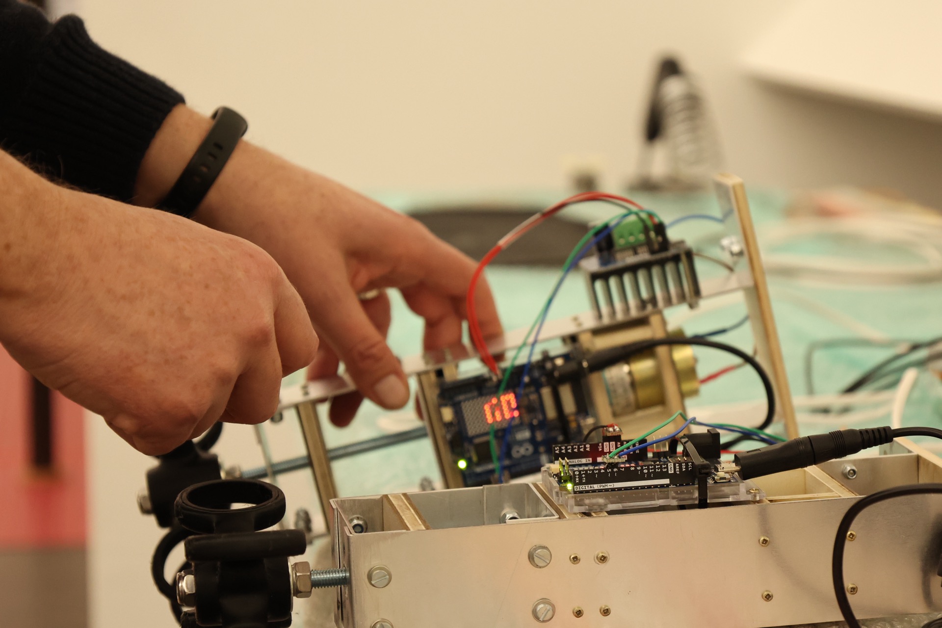 Each tube is driven by its own motor, controlled by an Arduino microcontroller. Four time-of-flight sensors measure the distance to whoever walks below. These readings travel over WiFi to a central conductor.